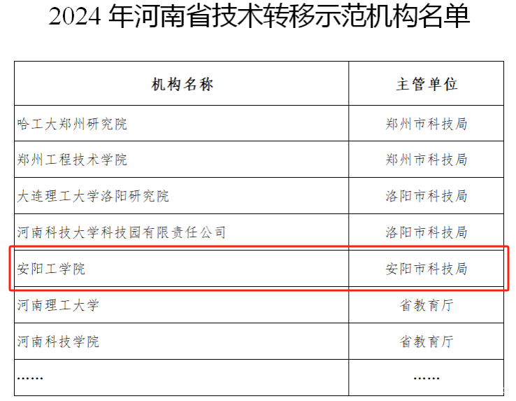 河南省科技厅公布了 2024 年河南省技术转移示范机构名单,我校成为此次获批的 31家省级技术转移示范机构之一,这标志着我校在推动科技成果转移转化、服务地方经济社会发展方面迈上了新台阶。